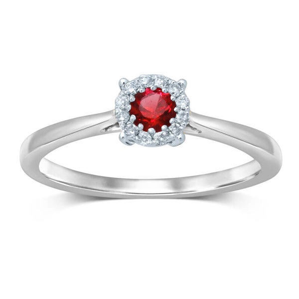 14 karaats gouden ring met briljant geslepen diamanten en 1 robijn van ca. 0,18 caraat.