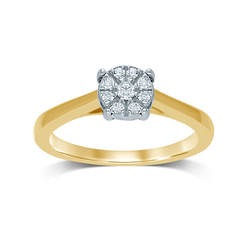 14 karaats gouden entourage-ring bezet met briljant geslepen diamanten.Gewicht van de ring: ca. 2,3 gramDiamantSlijpvorm: BriljantKleur: WesseltonZuiverheid: SIGewicht: 9- 0,10 crt.