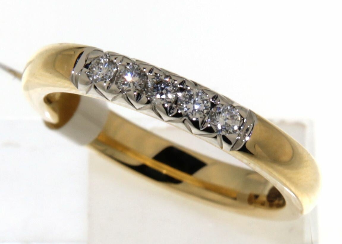 14 Karaats gouden rij-ring bezet met vijf briljant geslepen diamanten.Gewicht van de ring: ca. 5,0 gramDiamantSlijpvorm: briljantKleur: WesseltonZuiverheid: SIGewicht: 5-0,20 caraat