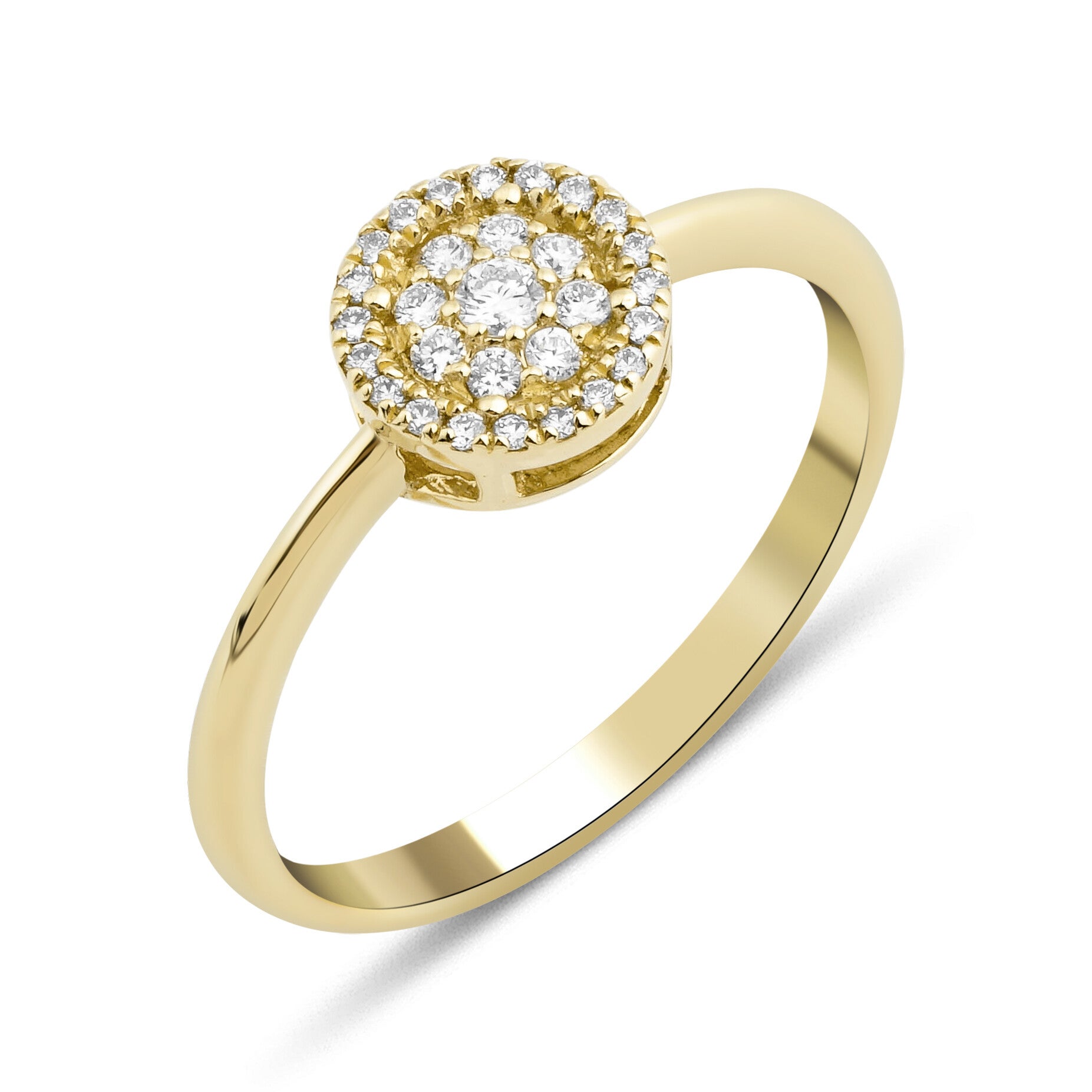 14 Karaats gouden entourage-ring bezet met briljant geslepen diamanten.Gewicht van de ring: ca. 2,15 gramDiamantSlijpvorm: briljantKleur: WesseltonZuiverheid: SIGewicht: 0,18 caraat.