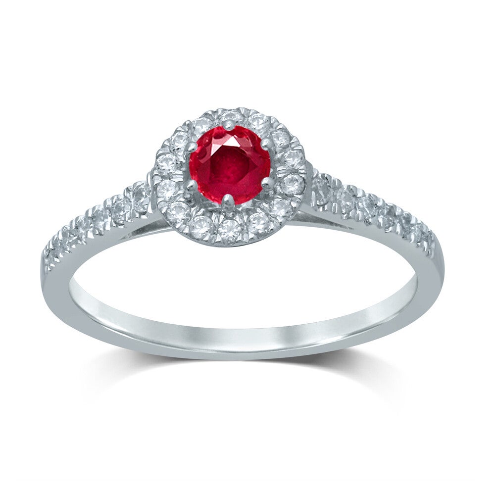 14 Karaats gouden entourage-ring bezet met briljant geslepen diamanten en 1 Robijn. Gewicht van de ring: ca. 2,75 gram Diamant Slijpvorm: briljant Kleur: Wesselton Zuiverheid: SI Gewicht: 28-0,26 caraat.